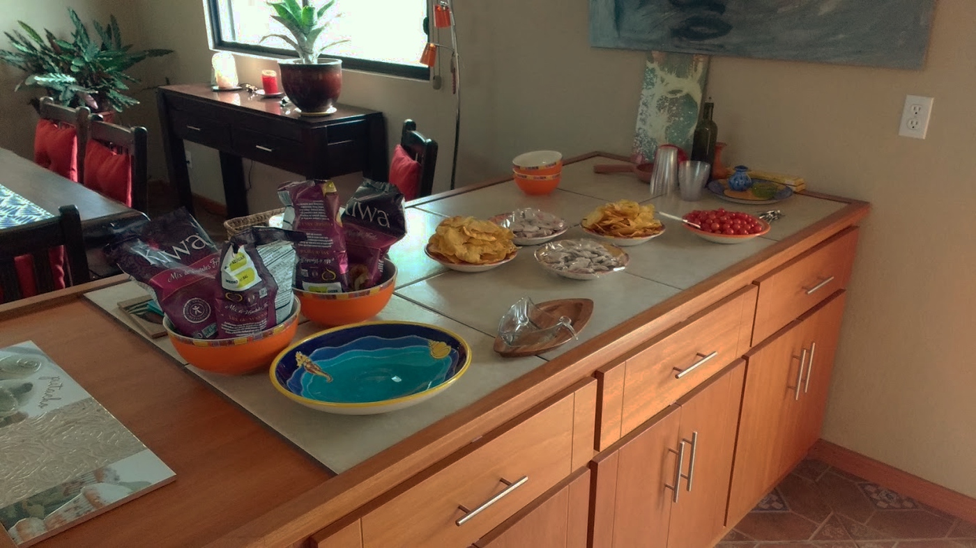 La gran sala/cocina/entrada tiene un atractivo mosaico estampado con asulejos de color liso en otros áreas.