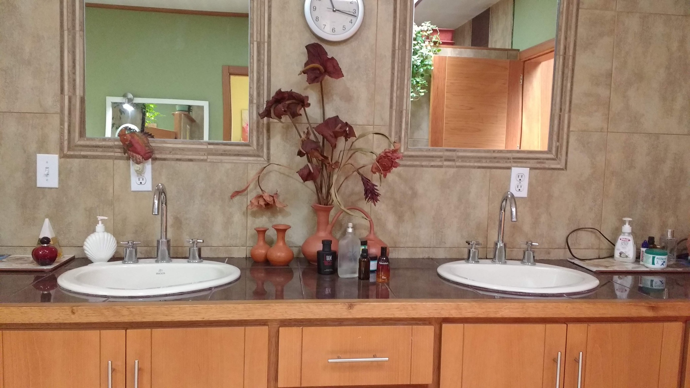 El baño de azulejos tiene una bañera de jardín, una ducha muy grande, un baño separado y un largo mostrador con lavamanos doble. El dormitorio principal es lo suficientamente grande como para una cama King, armarios y una sala de estar debajo del tragaluz de 3 secciones. Hay un amplio espacio para construir un segundo baño completo fuera de la habitación de invitados. Las habitaciones están ubicadas en cinco escaleras a través de un gran arco, en un área de entrepiso que agrega privacidad interior y mejora este atractivo plano de planta.