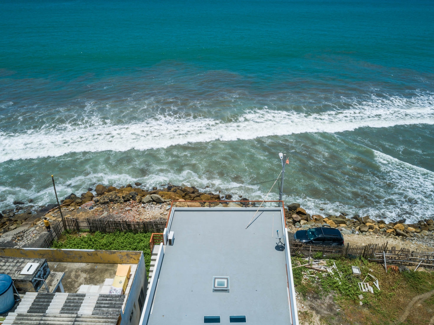La casa está construida sobre un terreno de 153 m2. Tiene 190 m2 de construcción de cemento en dos plantas más terraza de 90mt2 con vista al mar en 180 grados. El terreno sobre el que se construye la casa está protegido por un muro de gaviones (grandes rocas) y la casa está construida con un sistema de pivotes amarrados sobre un relleno de 2mt.