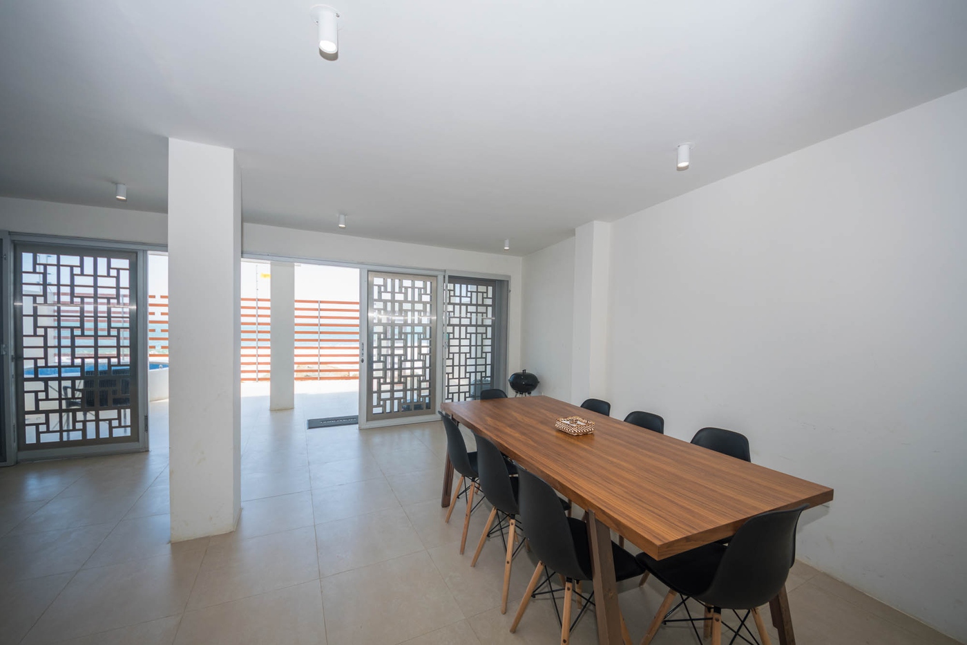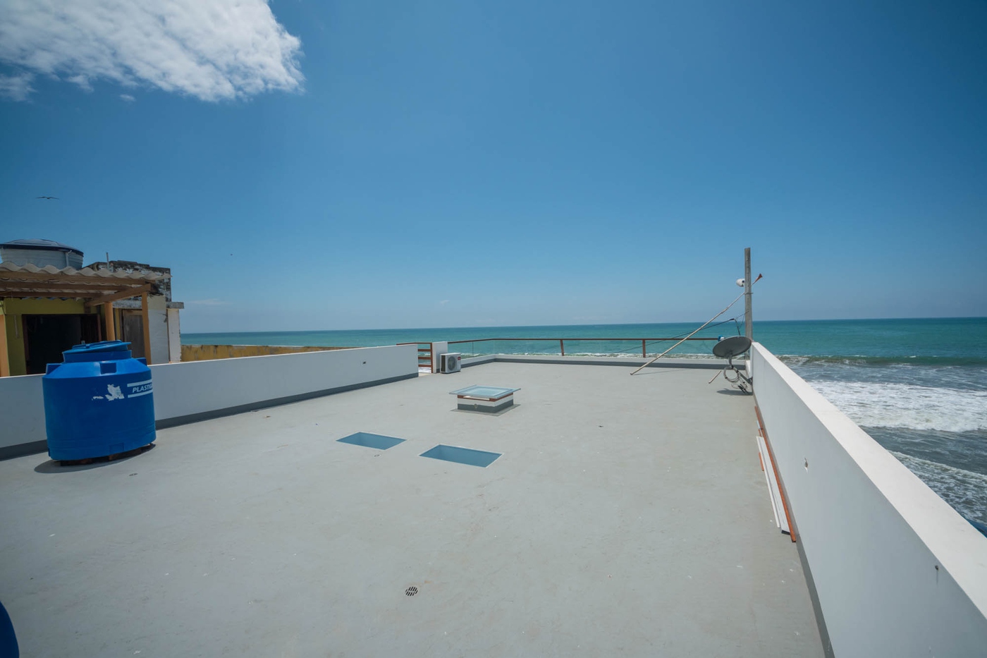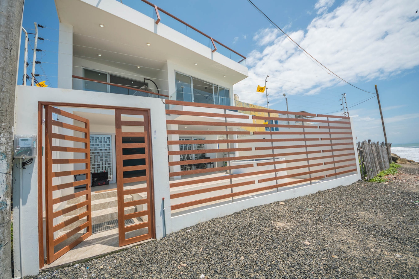 La casa está construida sobre un terreno de 153 m2. Tiene 190 m2 de construcción de cemento en dos pisos más terraza de 90mt2 con vista al mar en 180 grados. El terreno donde se construyó la casa está protegido por un muro de gaviones (rocas grandes) y la casa está construida con un sistema de pivotes amarrados sobre un relleno de 2mt.