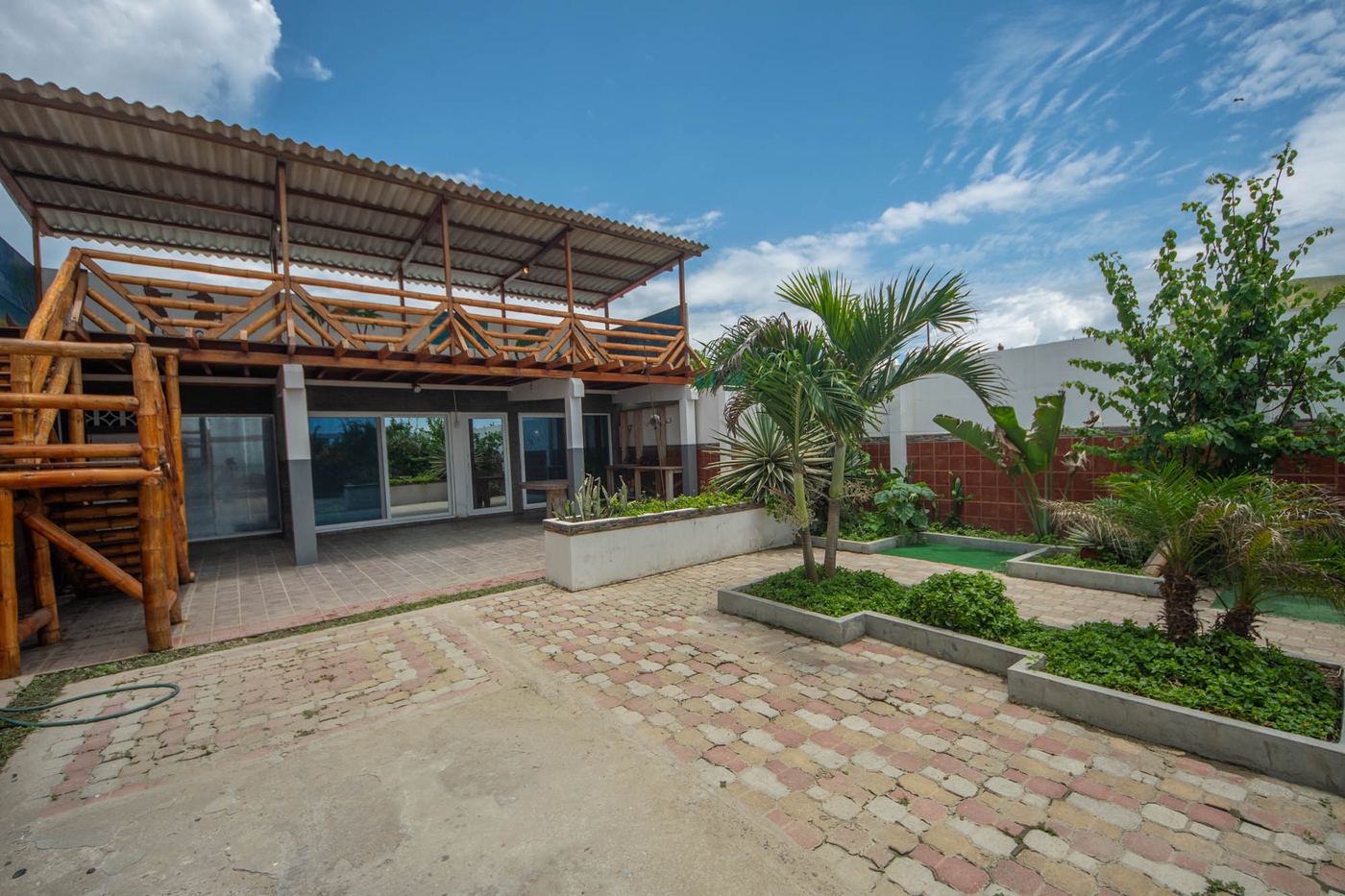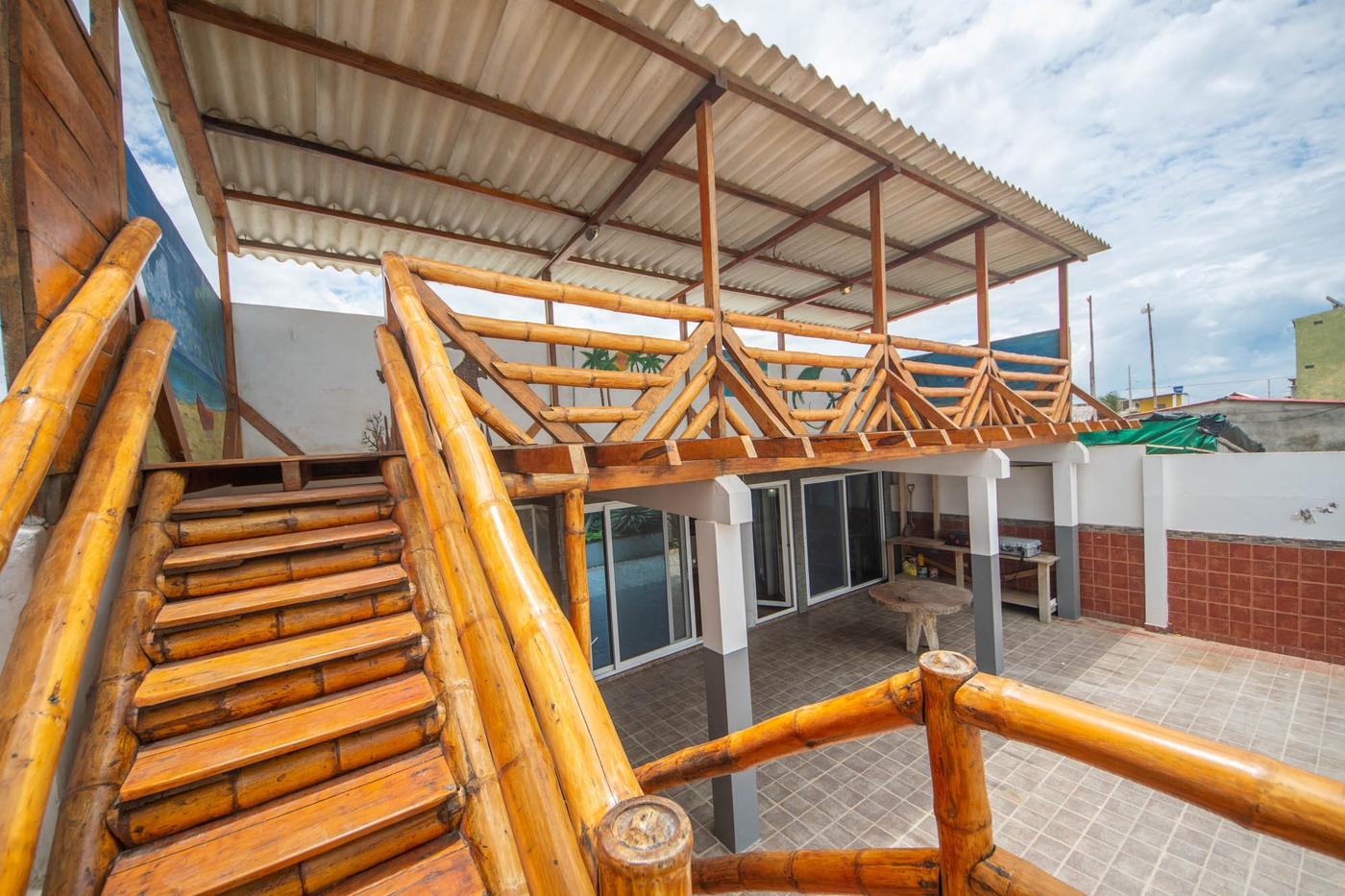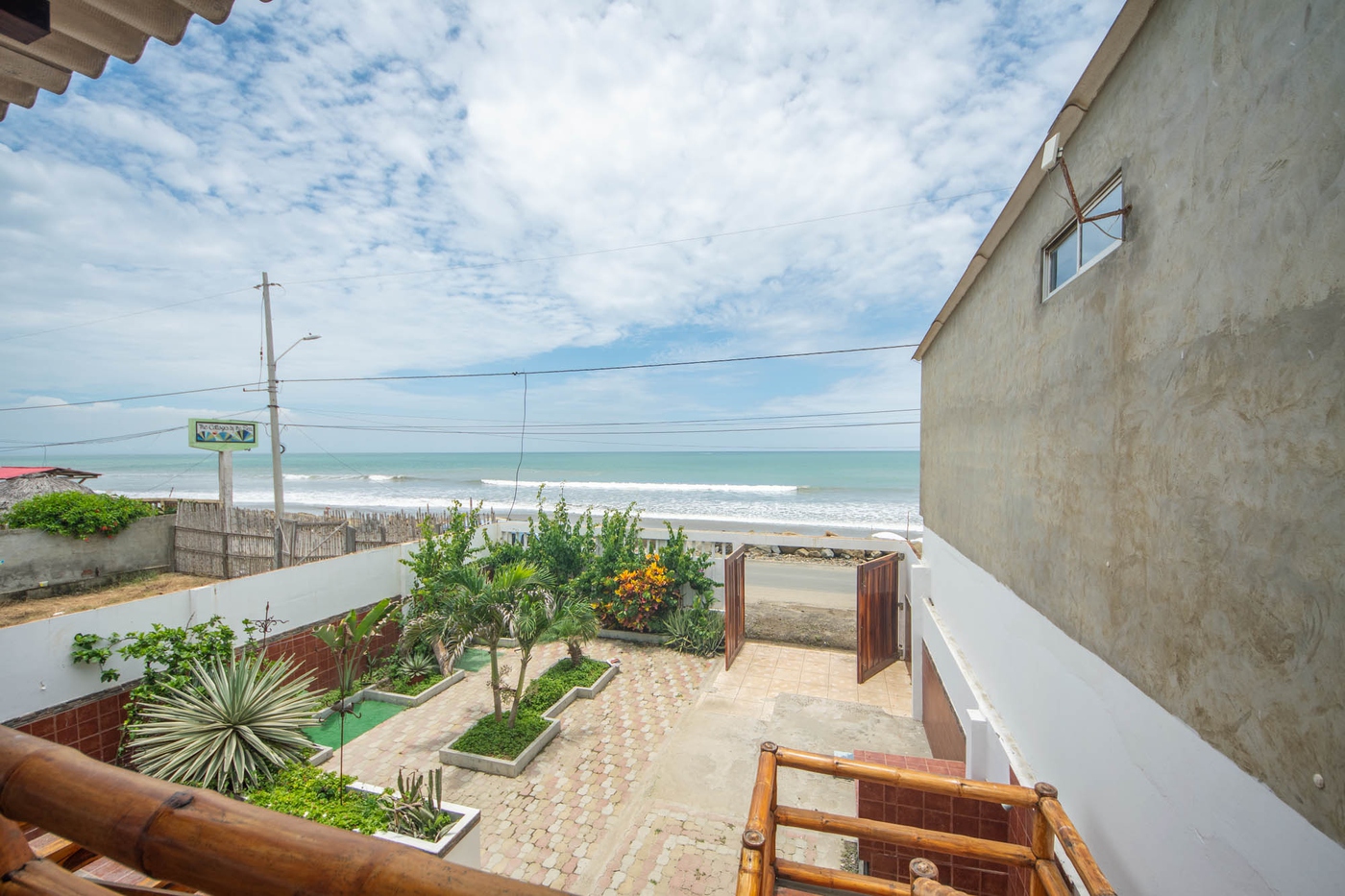 Es una ubicación frente a la playa y tiene un mirador exterior de bambú incorporado en el segundo piso con vista al mar. Frente a la casa, se encuentra la pequeña calle principal que cruza la playa de sur a norte, la Av. Malecón.