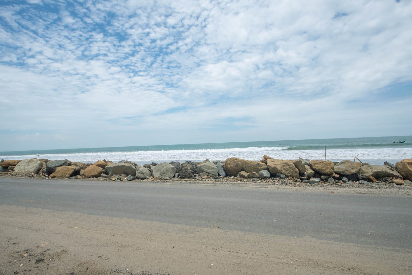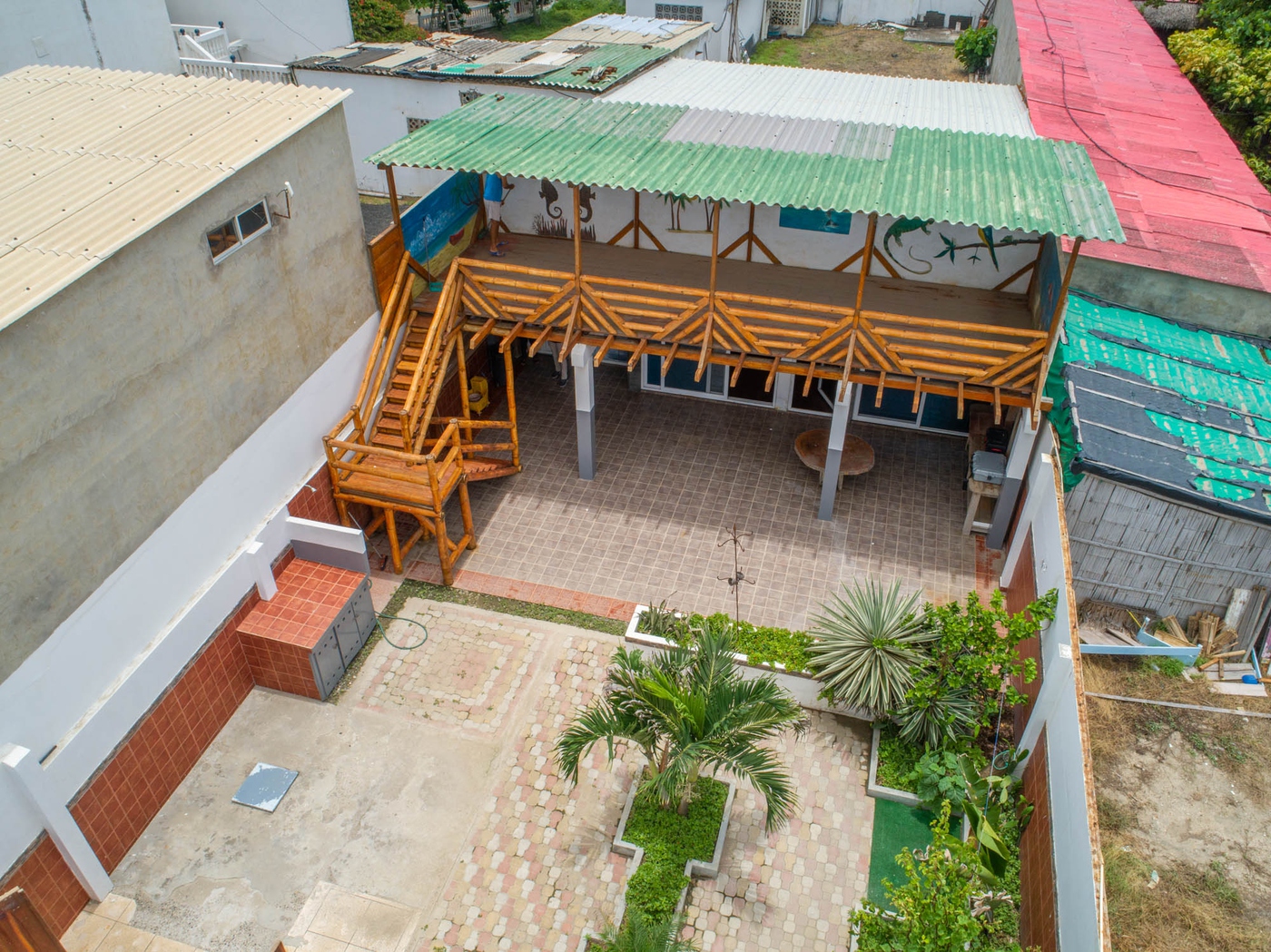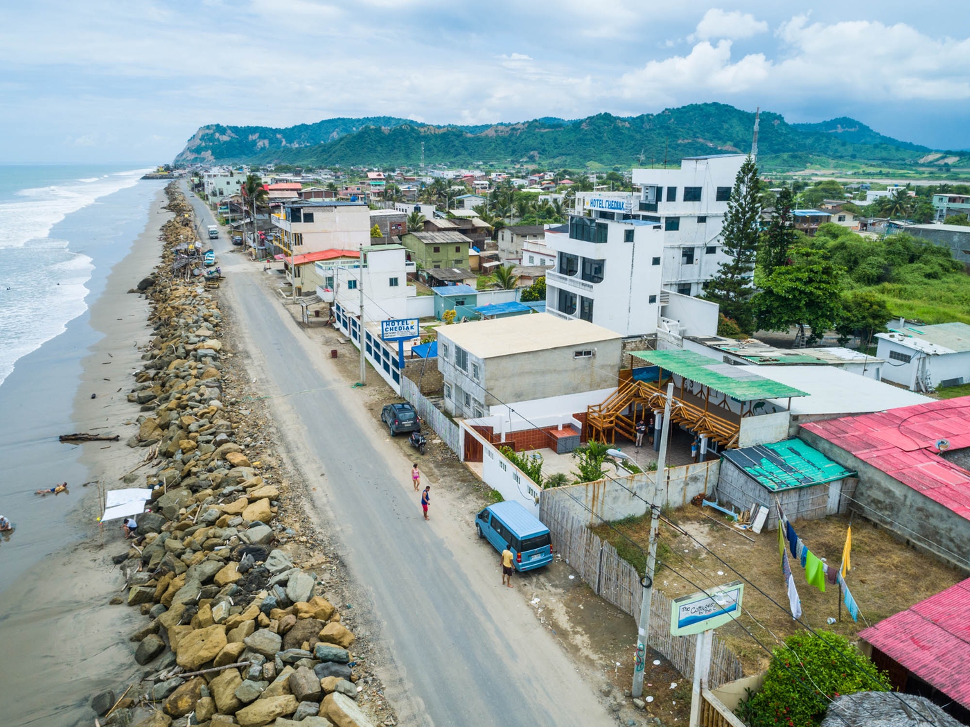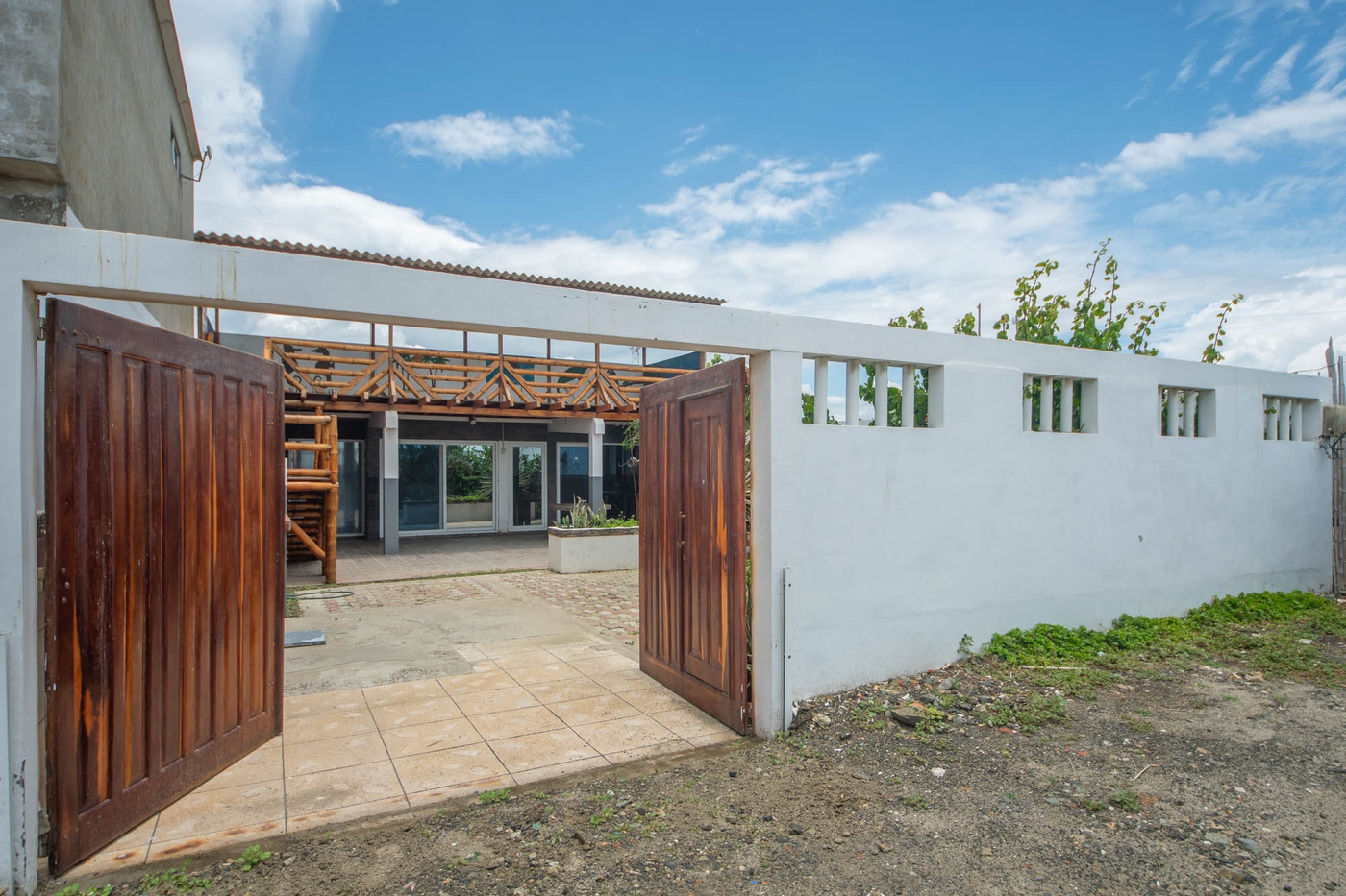 Es una ubicación frente a la playa y tiene un mirador exterior de bambú incorporado en el segundo piso con vista al mar. Frente a la casa, se encuentra la pequeña calle principal que cruza la playa de sur a norte, la Av. Malecón.