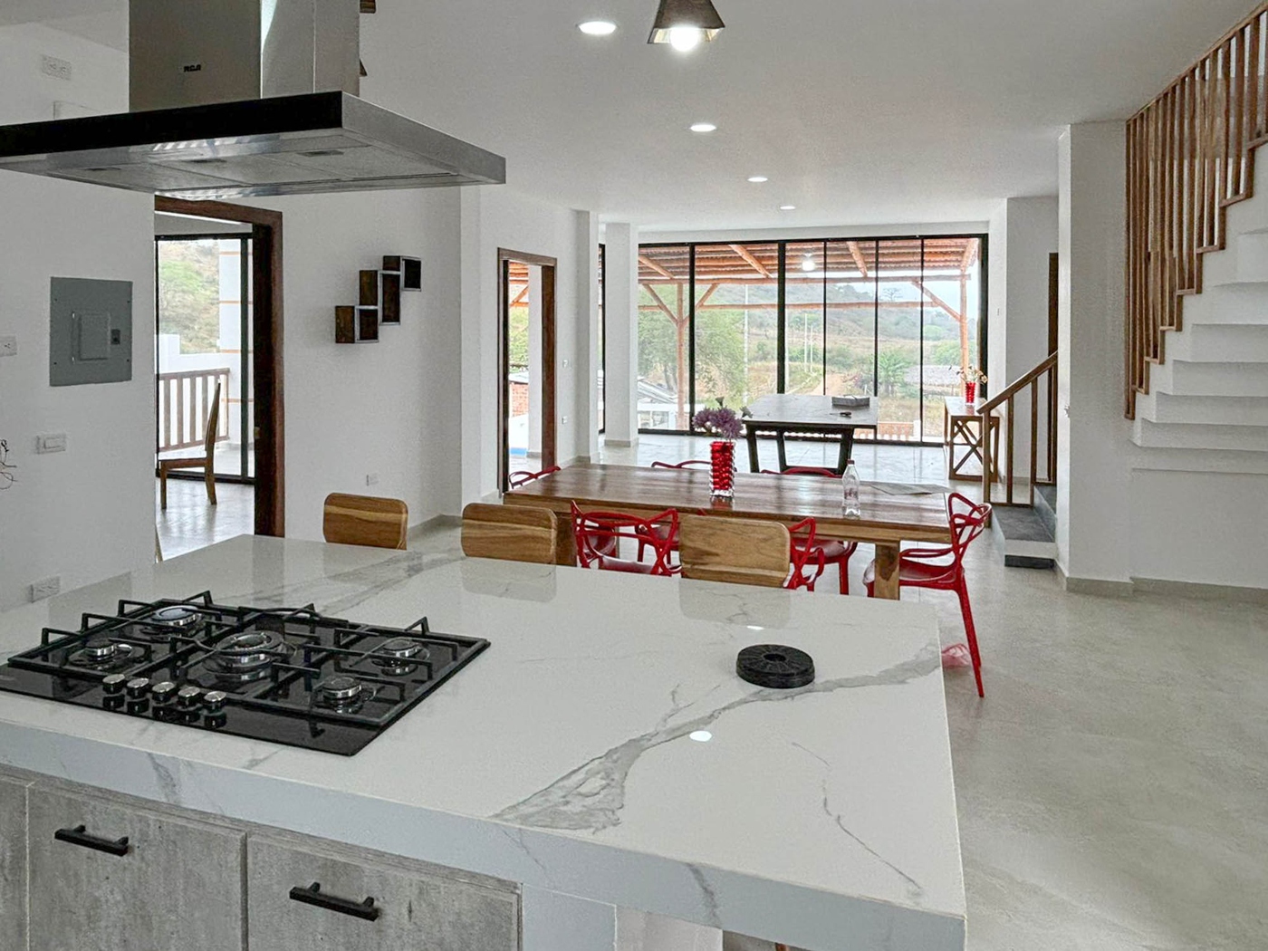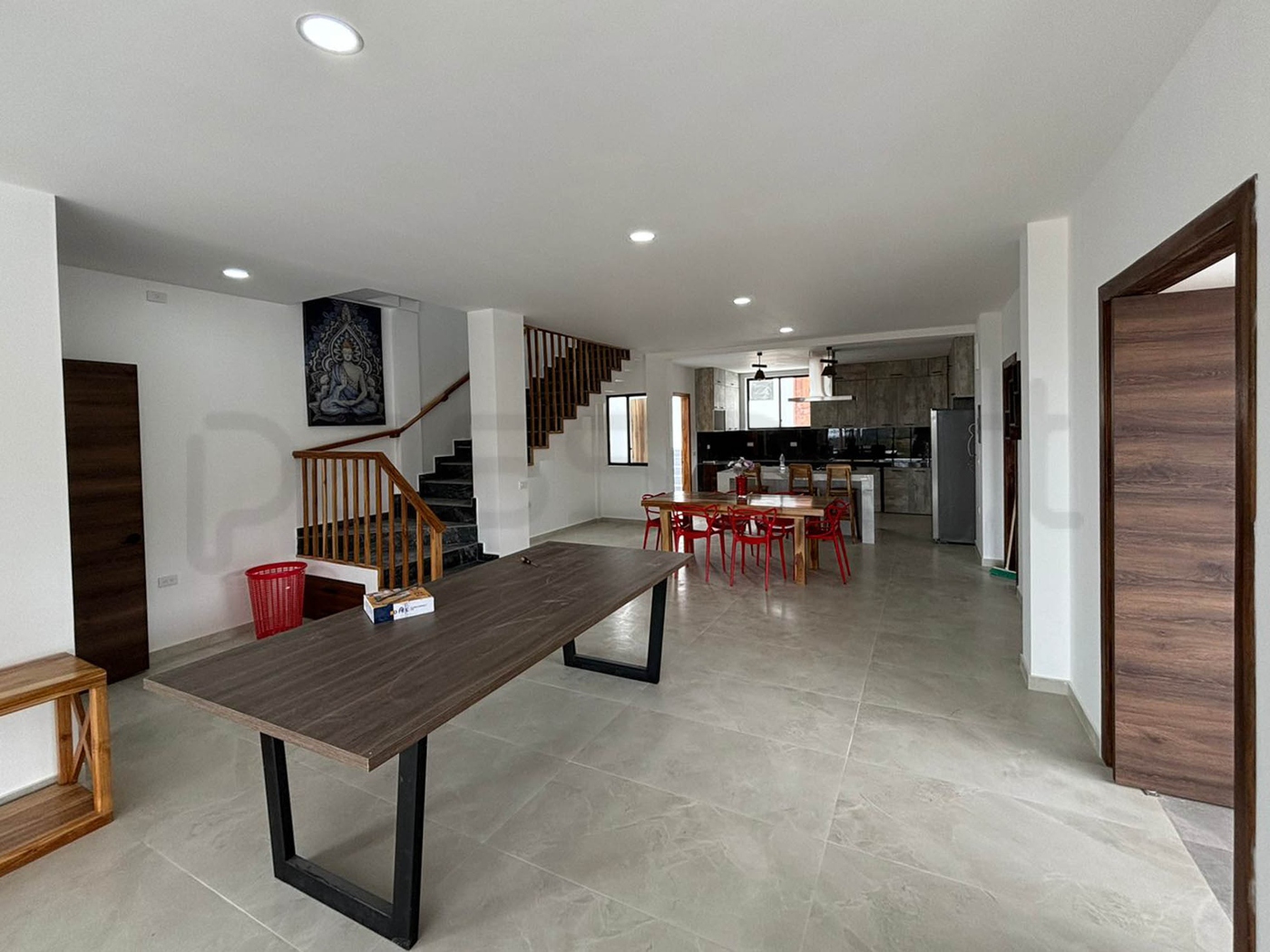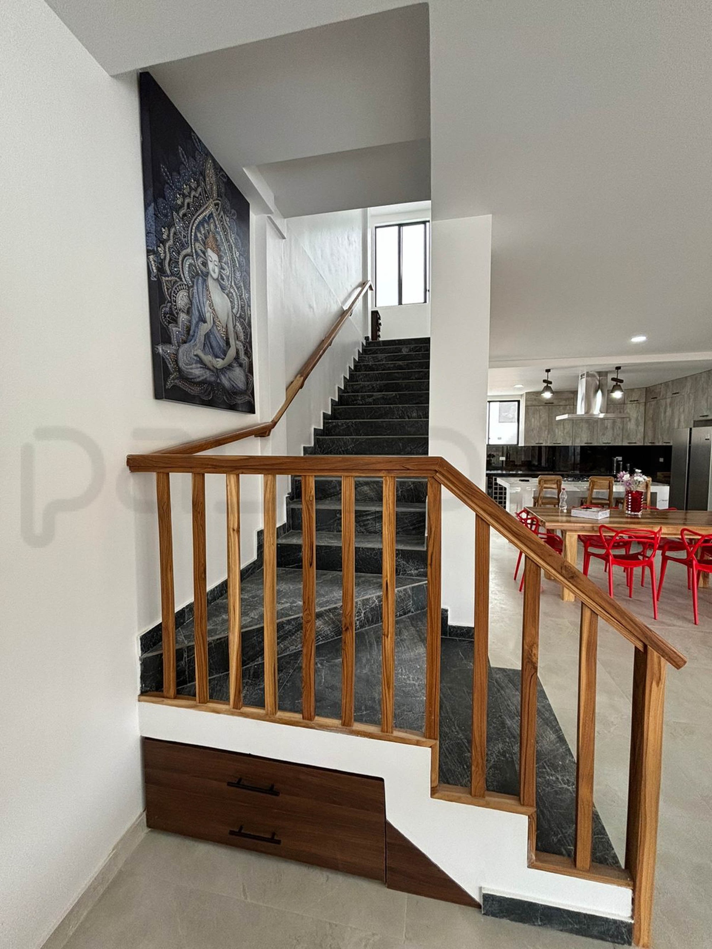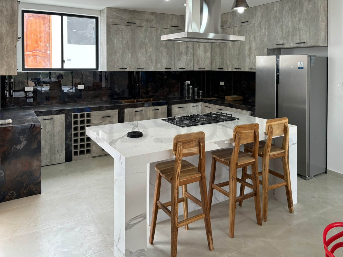Subiendo al segundo nivel, el área de la cocina viene completamente equipada con estufa, ventiladores y gabinetes de cocina, proporcionando un espacio funcional y elegante para delicias culinarias. La elección de porcelana para los mostradores de la cocina y los baños agrega un toque de elegancia al diseño general. El diseño de planta abierta conecta sin problemas la cocina con los espacios de vida, creando una atmósfera acogedora y espaciosa.